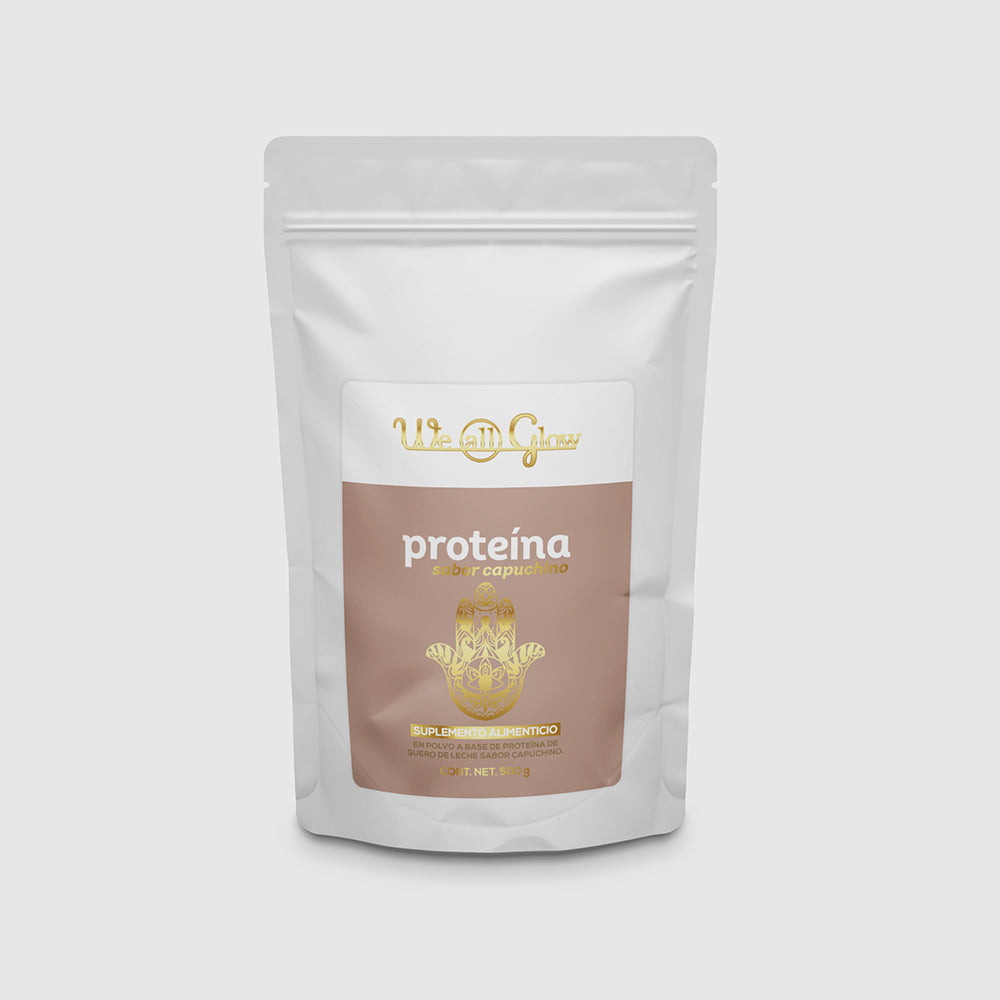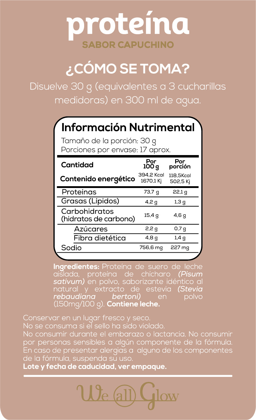 Proteína en polvo sabor Capuchino con 22.1 grs. de proteína por porción.