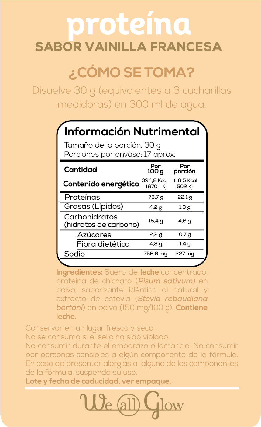 Proteína en polvo sabor Vainilla francesa con 22.1 grs. de proteína por porción.